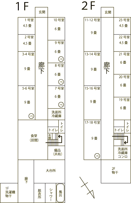 全部屋に下記の備品があります。 ・インターネット(部屋ごとに無料WI-FI有り) ・火災報知機 ・エアコン ・クローゼット ・整理タンス ・コタツ ・照明 共同家電は以下の通りです。 ・アイロン ・冷蔵庫 ・掃除機 ・洗濯機 ・電子レンジ ・オーブン ・トースター (居間にあるもの) ・地デジ液晶テレビ ・扇風機 ・エアコン ・ファンヒーター ・ウォーターサーバー